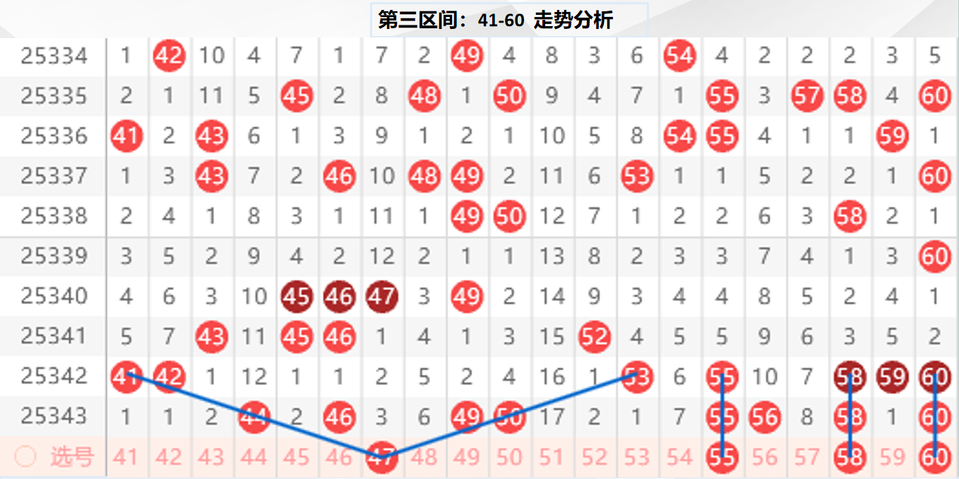 三区分析:【41-60】(走势图标注号码非小黄车大底,请谨慎参考,具体思路将在直播间分享讨论)