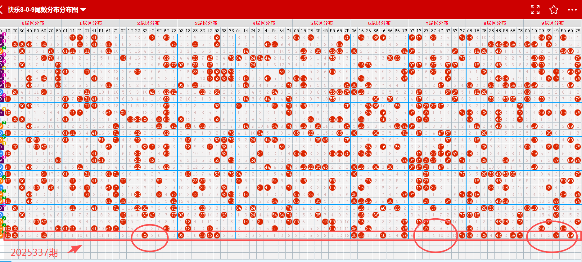 上图是快乐八2025337期的尾码走势图,从图中看0尾到9尾出号个数依次是:0尾号码区开出3个;1尾号码区开出0个;2尾号码区开出1个;3尾号码区开出4个;4尾号码区开出0个;5尾号码区开出0个;6尾号码区开出4个;7尾号码区开出1个;8尾号码区开出5个;9尾号码区开出2个;再看小尾号码(0尾-4尾)区有8码,大尾号码(5尾-9尾)有12码;数据比对统计后可以看到本期8尾出号数量最多,一共开出了5个中奖号码。本期1、4、5尾出现断区!由走势比对推断2025338期重点需要关注2、7、9尾区号码下号热度回补和落号数量增加的概率较大。