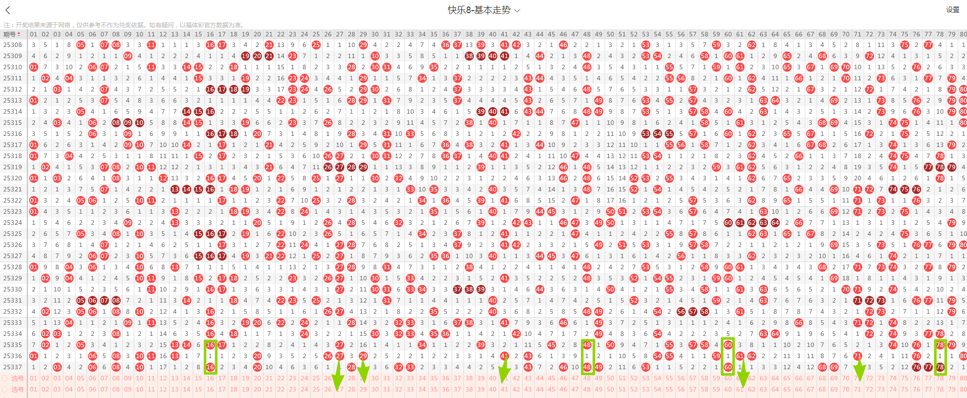 从这张走势图可以看到我画标出来了遗漏示意号码,开出了隔期(遗漏一期的)4个号码(绿色方块标示的),数量与上期增加,从近期走势图看隔期码回温态势形成,本期判断热度回温,落号5个号码概率较大(绿色箭头标示的27、29、41、61、71)需要关注,有下号概率;
