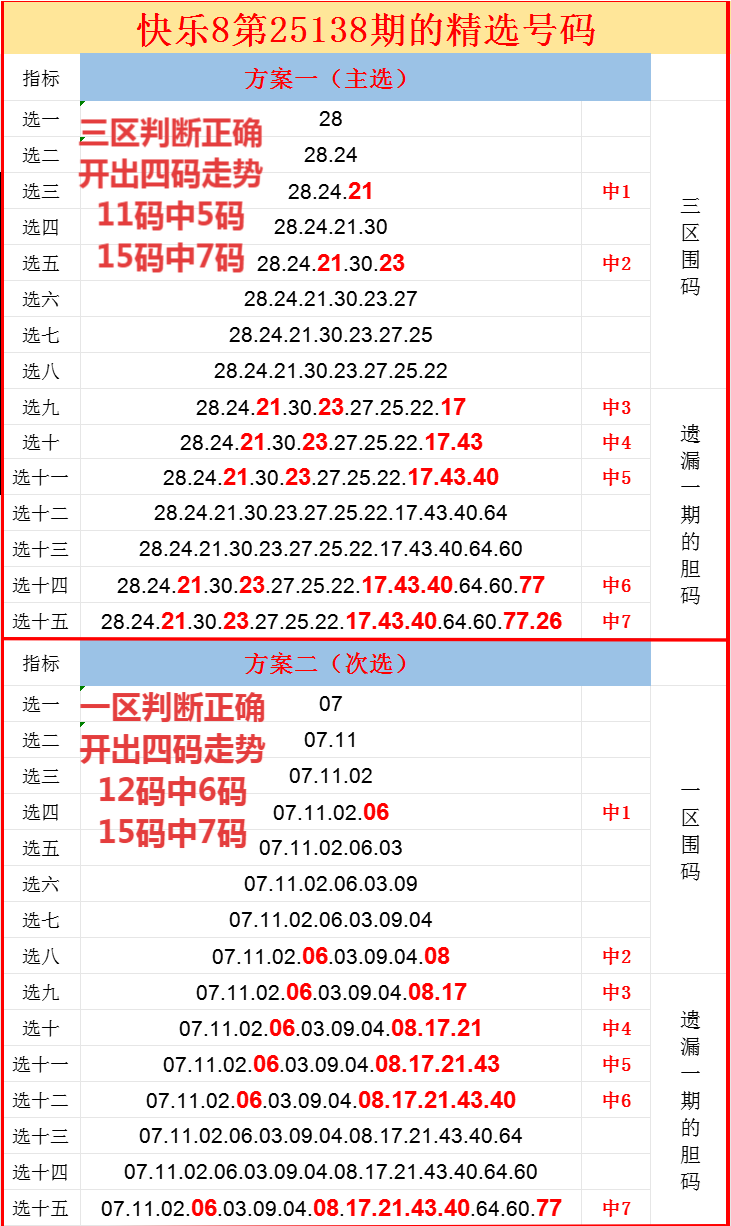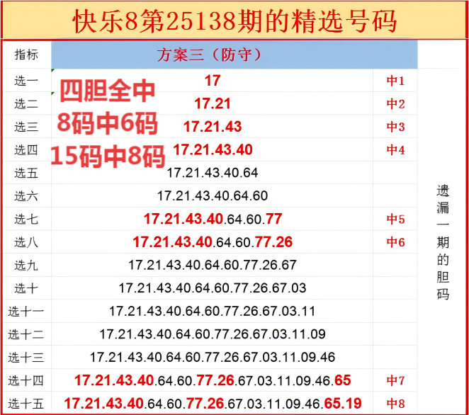 方案三:主打的遗漏1期的号码,四胆全中!8码中6码!15码中8码!
