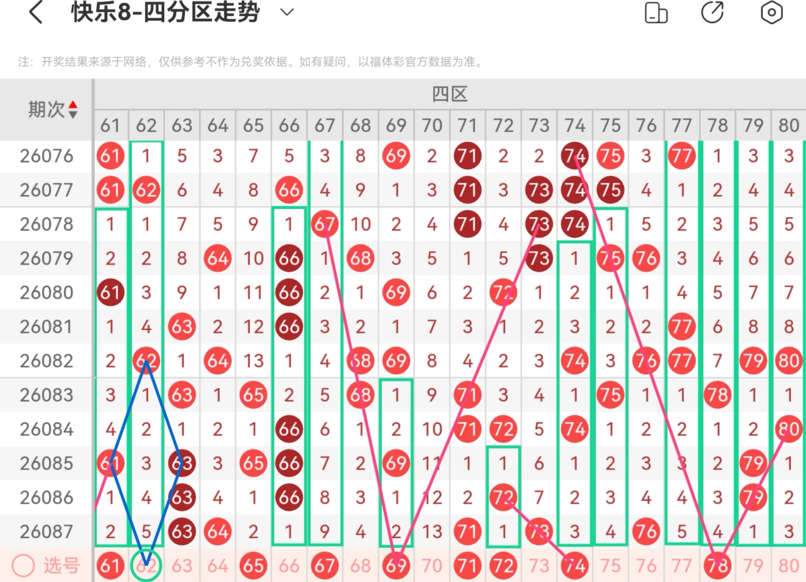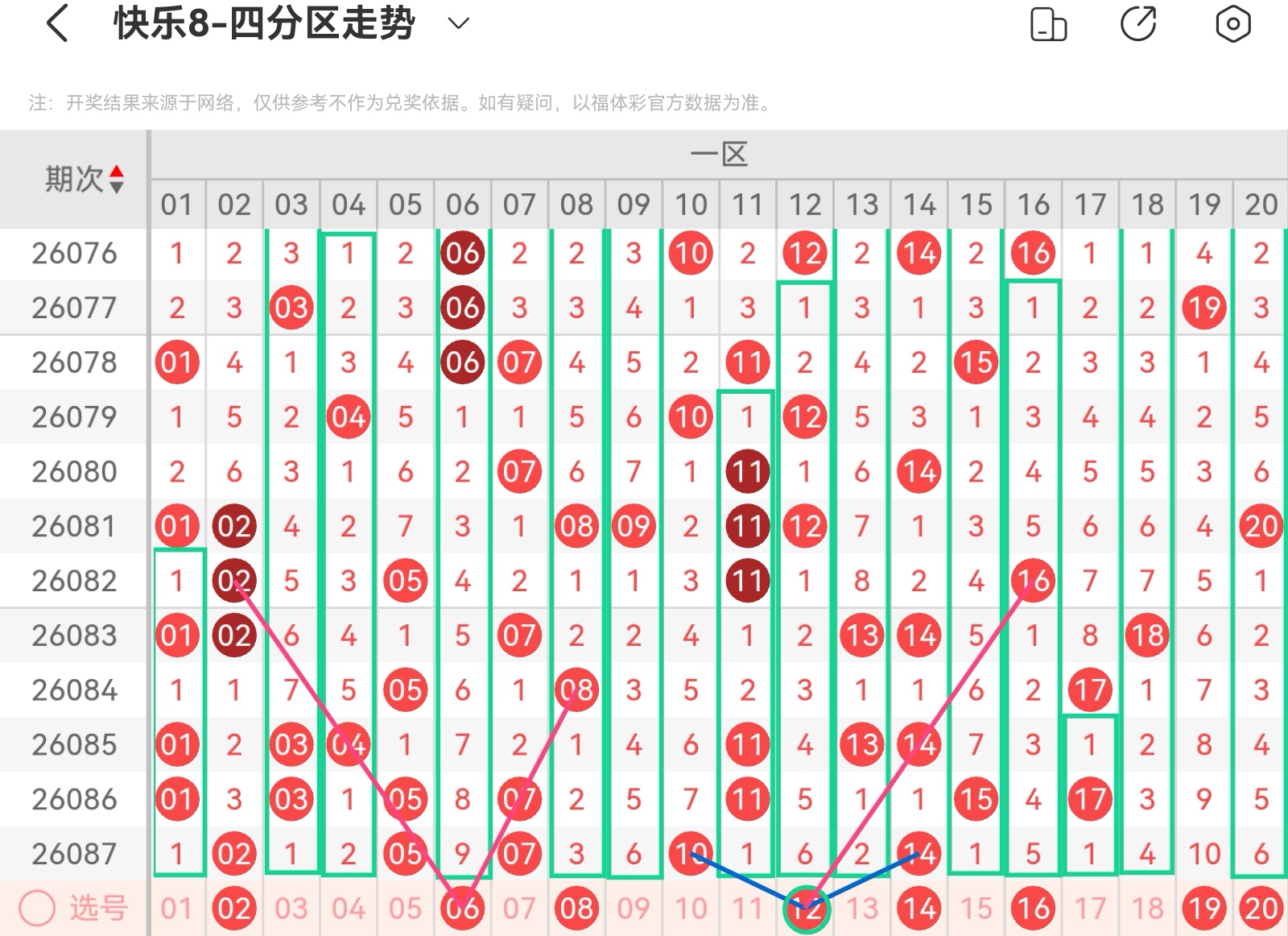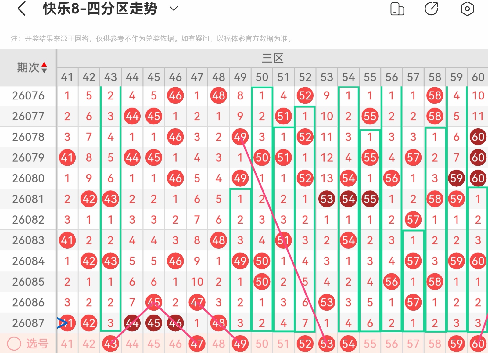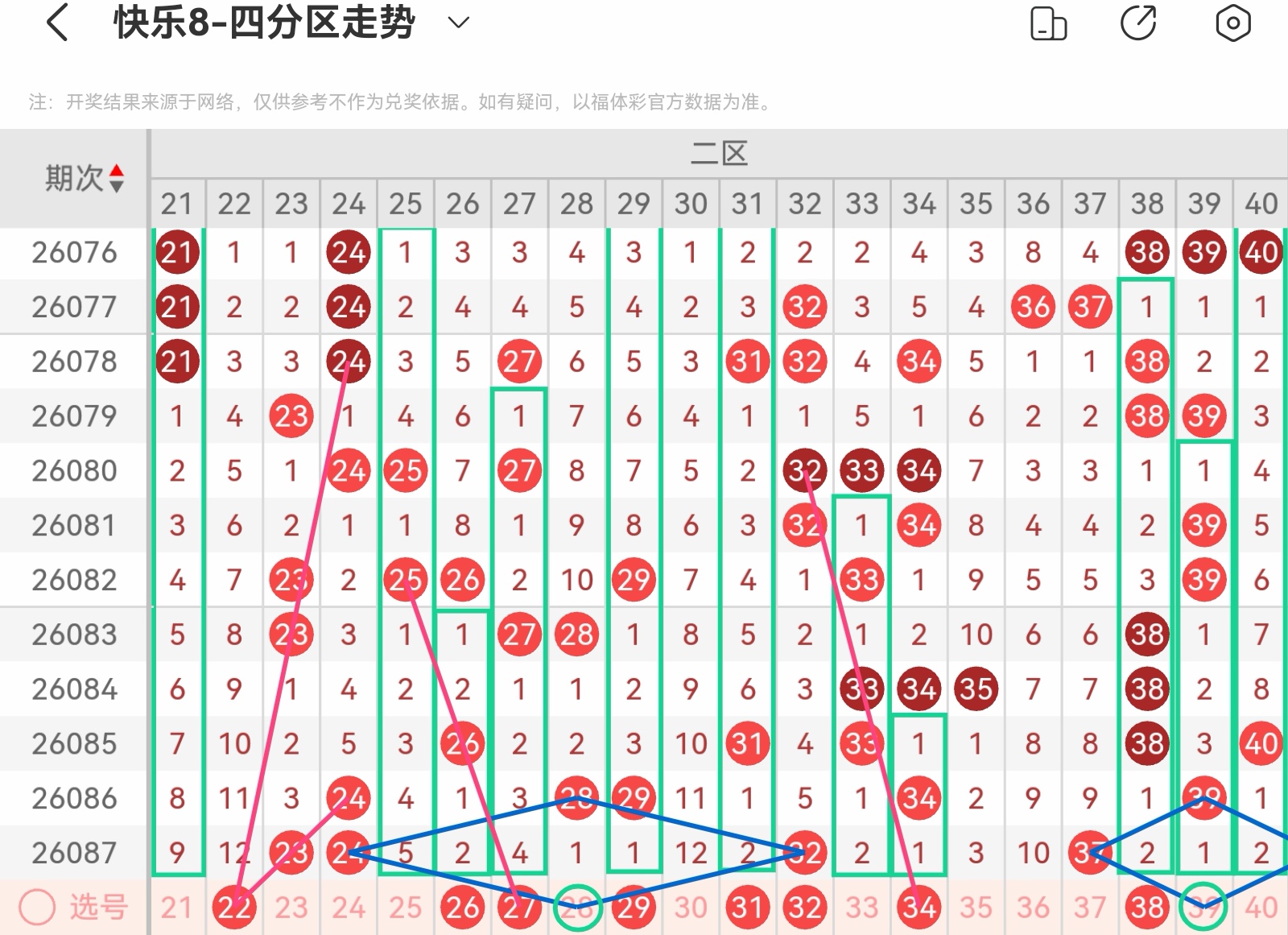 大家好,我是甜丝丝的坏事,主要以快乐八的形态走势、空位走势、遗漏走势以及斜连走势相结合的方法,用公认的四分区走势来进行预测分析,希望能让你有所收获。