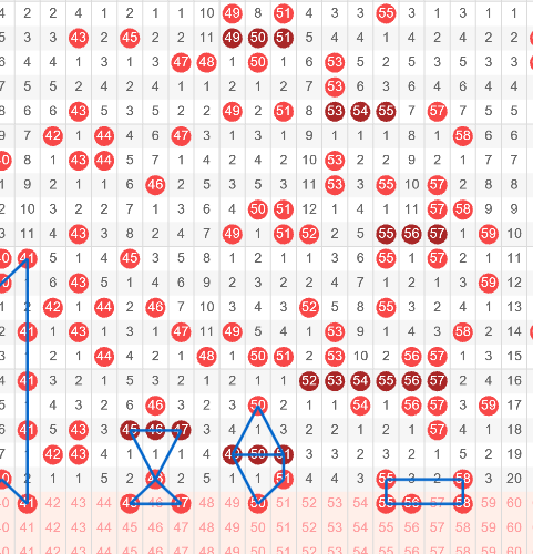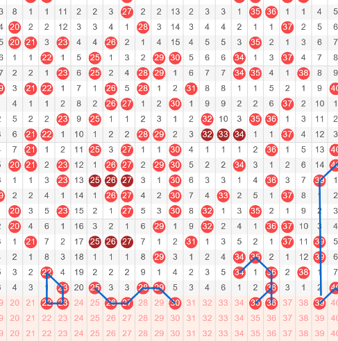 22 23今天这个是形态号,也有机会开出一到两码的,26 27 30它是一个非常漂亮的三选一点位的一个号,30的点位今天我比较喜欢,35 36很可能会开出一码或者两码组合;其中39是一个百期规律号;35 36 39今天关注三码组合, 是个同区间的热形态,38 39这里看的是有机会开出一到二码组合;
