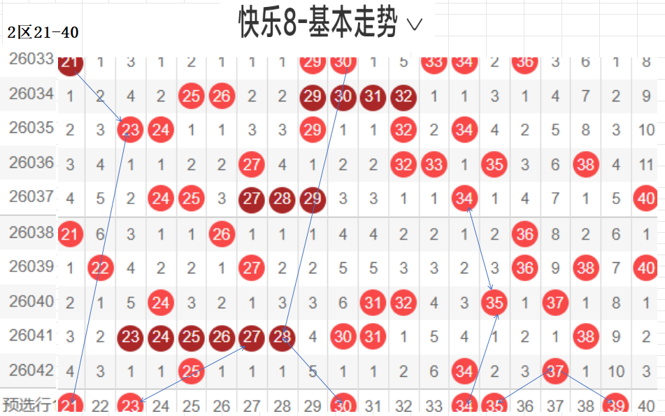 二区(21-40):遗漏5期以下有18,025 34 37  3,数据所示,冷码平均,选择条件增多了.上期开出了3个号码,出码比较分散.这期布防相应增加,重码按比例落这区较少,先给出关联码39,这个区间间接走势,温区,21-30区间上期开了1个,依旧不是重点选号区间,31-40区间开出2个,本期关注热码的回补,间隔小遗漏值最佳,3字头转热,这个小区热码注意回调,可以做关联码的布局,注重温冷码的回补.