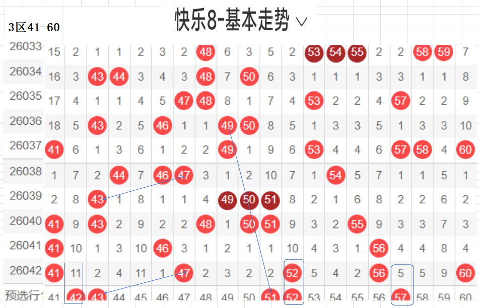 三区(41-60):遗漏5期以下有17,041 47 52 56 60  5,温开方式,这区码数有回暖之意,可以防一手,先定胆码走势较大者,隔期,斜三连,分边号码,可重防,间隔5以上号码可以随走势选取,例如本期大冷码,走势比较大,可以做胆,通常联动可带出,分边对称的号码,本区间也有很大走势.可关注下.隐形夹角号码.做补位形态号码.都需要观察动态走势.以上是本区间的选码方法.