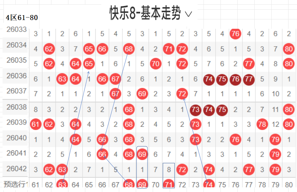 四区:(61-80):遗漏5(5)以下有17,062 63 72 74 77 79  6,平均温开方式,上期开出6,区间回暖,后区可防,区间从以往数据来看,重码很强,一枝独秀的存在,近期有回补走热的趋势,区间回暖,本区间后区可防,与一区相比,也是温区.,对称下落,隔期回补码,可以防,这区对呈对称三角关系的胆码,斜三连有走势的胆码,联动落位码,都有各自的走向落位关系,根据走势选择一种方式选码.