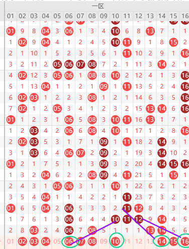 本期一区胆尾3尾 4尾,上期边号重号没断,本期接着关注,重号三直落四直落不出那就是3 8 13三出一,3尾比较热看好3,不喜欢3试试13,边号2 4 5 7 9 12 出号,形态上6 10 14 16是斜连号,上图已勾画,6尾最热看好16,4尾出四期可以关注4,那么本期关注五码 3 4 10 13 16