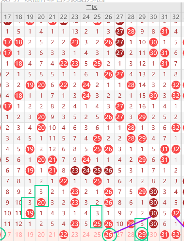 二区看好0尾9尾,边号22 24 25 26 27 29 31要出号,形态上26 是斜连号,上图已勾画,本期有9尾,那么就是19 29二出一,其中29是隔三期号,上图已勾画,如果29不出,那么就是19,0尾连出四期,本期如果0尾不断那么20 30要出一个,重号23 25 26 28 30要出一码,看好28其次26 25,结论关注五码19 20 28 29 30