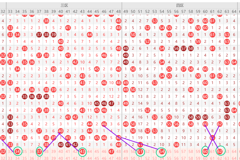 三区胆尾5尾,边号34 37 43 47要出一码,上期重号出三码,本期重点看重号,3尾最热看好33,其次看40 41,形态上34 37 43是斜连号上图已勾画,本期看好有5尾,35 45二出一,那么本期关注五码33 34  37 43 45