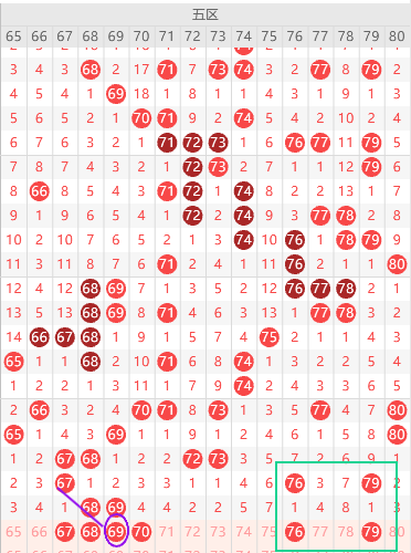 五区胆尾8尾,上期开出二码,重号近期隔一期出一期,那么本期看好重号68 69出一码,边号67 68 69 70出一个,形态上69是斜连号,上图已勾画,本期看好有隔一期号76 79出一个上图已勾画,防74,那么本期关注五码67 68 76 79 74