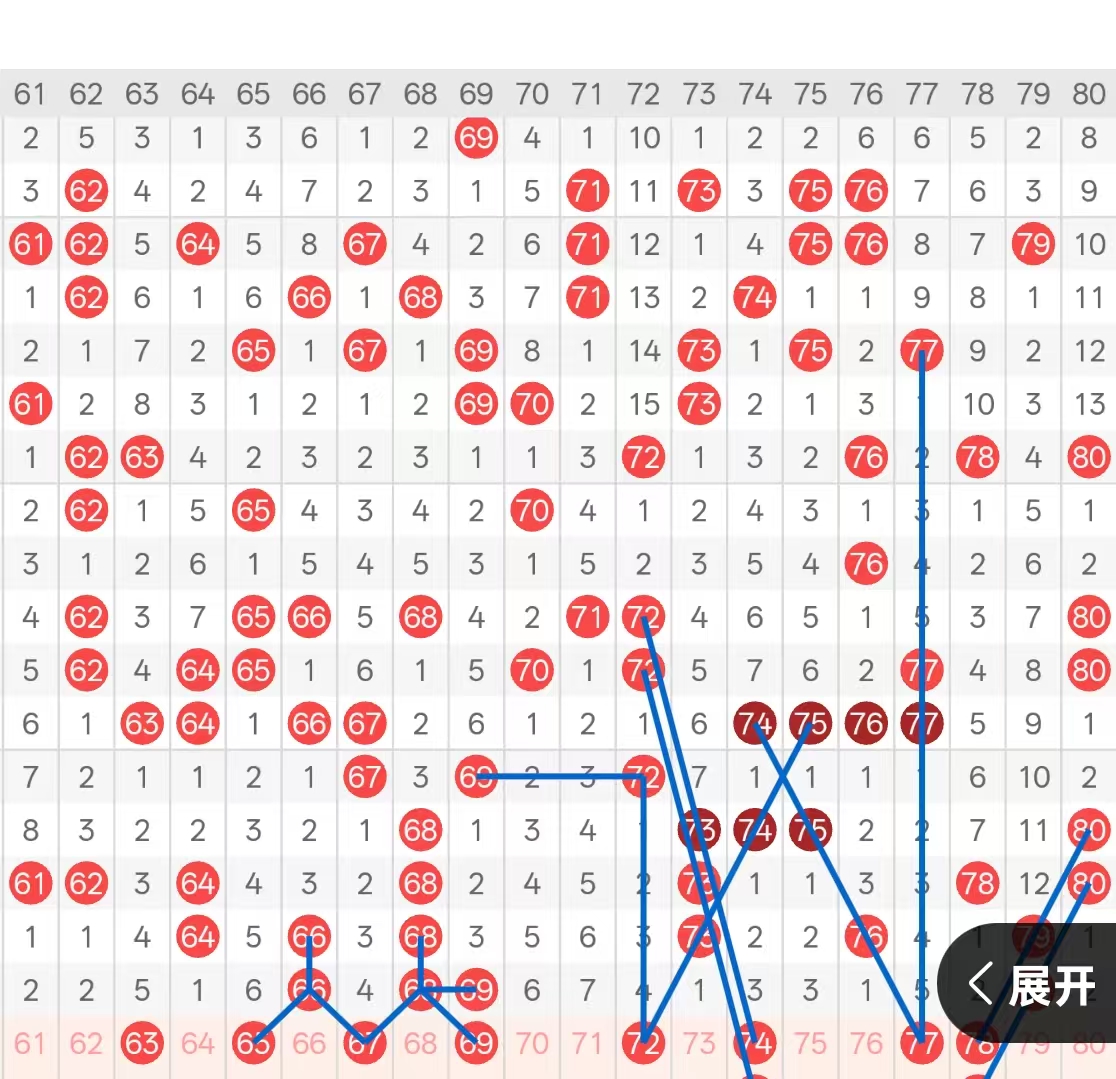 四区:四区间上期开出四码,六字头开出中部位置66的双重,以及68-69对子,头部位置处于放空状态。七字头则仅仅开出尾部位置的79双重,前端部分一码没有开出,处于放空状态。本期六字头头部位置关注61-62对子空二回补,其次该区间的五期遗漏63-77两码做二选一即可。66-68同时做重,本期关注65-67-69三码的下号,且65-70两码为本期的六期遗漏号码,重点防守一码开出。七字头头部位置关注本期唯一一码七期遗漏号码71的开出,其次74-75两码二选一,尾部位置79的双重分边78-80防守一码开出即可。
