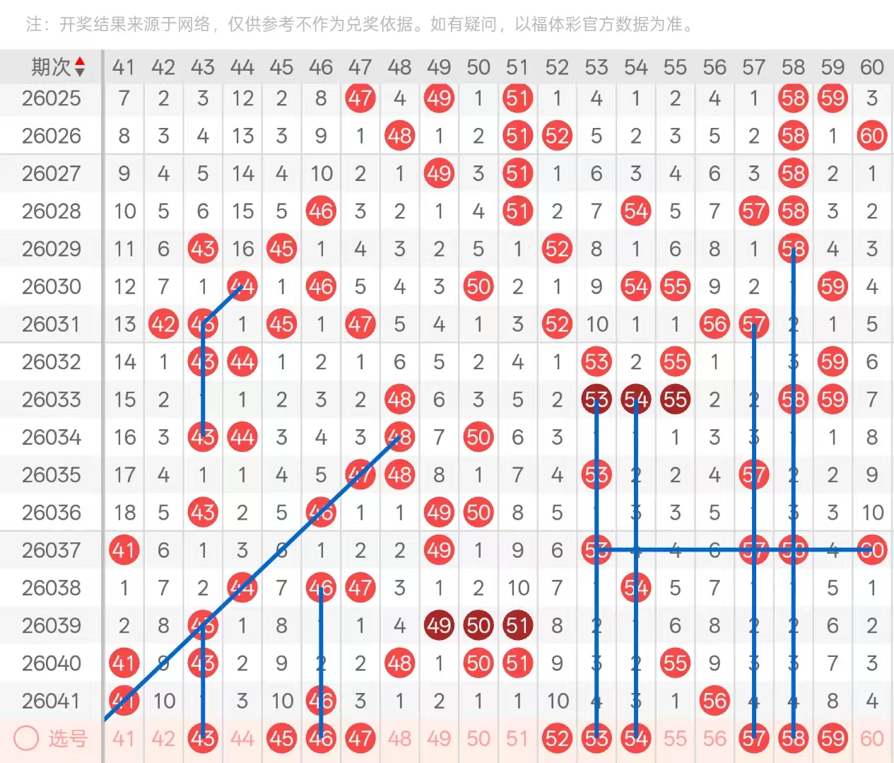 三区:三区间上期开出三码,四字头开出头部位置双重的41,以及中部位置空二回补的46,以孤码形态开出,尾部位置处于放空状态。五字头则仅仅开出中部位置九期遗漏下落的56,头部位置与尾部位置均处于放空状态。本期四字头头部位置可以关注41双重分边40-42二选一,还需要看43的空一回补,中部位置46以孤码形态开出,本期要重点关注做重,其次分边45-47二选一,该位置要防守开出连号,尾部位置48-49-50三码做三保一即可。五字头头部位置空一回补的51防守即可,重点关注52的十期遗漏开出,与四字头的42-45,以及一区间的15在本期需要考虑一码开出。53-57-58-60四码三期遗漏在本期要重点关注一码下落,其次59的八期遗漏也需要防守开出。