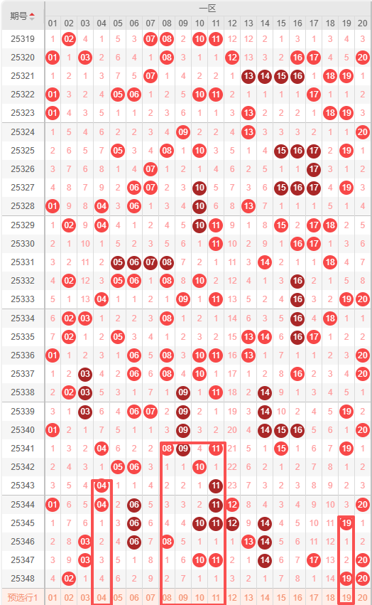 一区:最近一区10期出号情况为:6 6 6 3 2 6 6 5 6 3,总出号情况为49个,平均出号4.9个,本期一区号码推荐出号为:04 08 09 10 11 19。重点关注:09 10 11 9。