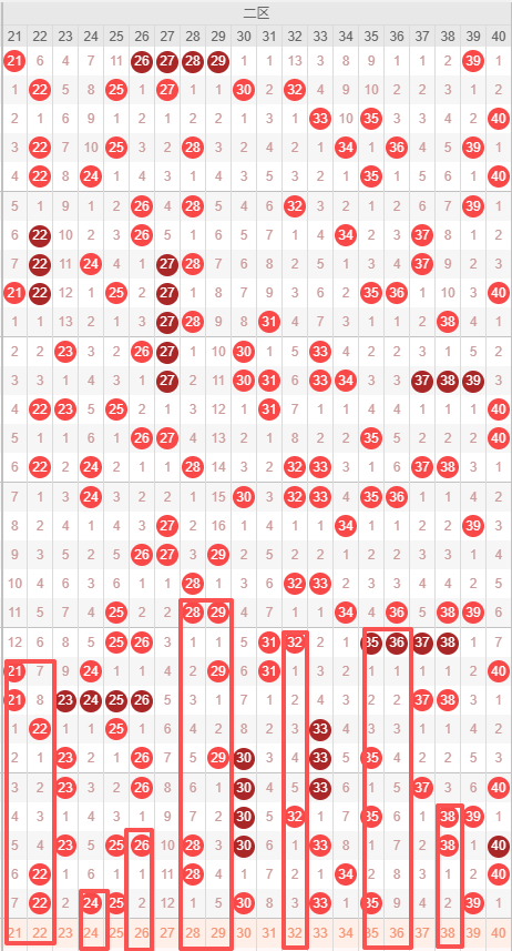 二区:最近二区10期出号情况为:8 5 7 3 6 6 5 8 4 7,总出号情况为59个,平均出号5.9个,本期二区号码推荐:21 22 24 26 28 29 32 35 36 38。重点关注:21 29 32 35 36 38。