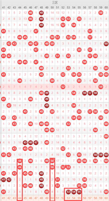 三区:最近三区10期出号情况为:1 4 4 7 8 4 5 5 6 6,总出号情况为50个,平均出号5个,本期三区号码走势推荐:44 50 53 54 55,重点关注:44 50 53 54。