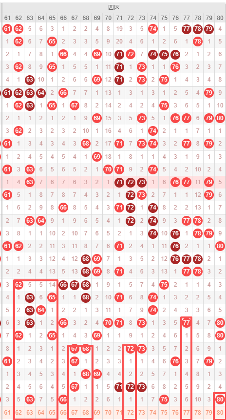 四区:最近四区10期出号情况为:5 5 3 7 4 4 4 2 4 4,总出号情况为42个,平均出号4.2个,本期四区号码推荐:62 63 64 65 67 68 72 77 80。重点关注:63 64 65 67 77 80。