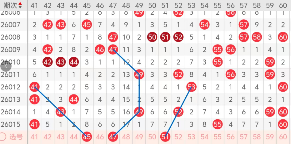 第三区间的走势分析:第三区间上期开出了三个号码球,主要的落号点位在三区间的后半区,走出了辆奇一偶的形态走势,上期三区间的前半区落下了一个号码球,后半区落下了两个号码球,整个三区间处于走冷的趋势,根据三区间的走势规律,今天的三区间我们主看三区间斜连码的落位,主看45 47 51这三个号码球的落位,45 51走出了斜连码的走势,47走出了对称的形态走势,这三个号球建议大家打个三胆拖,或者打个三码复二比较稳妥,参考为主!