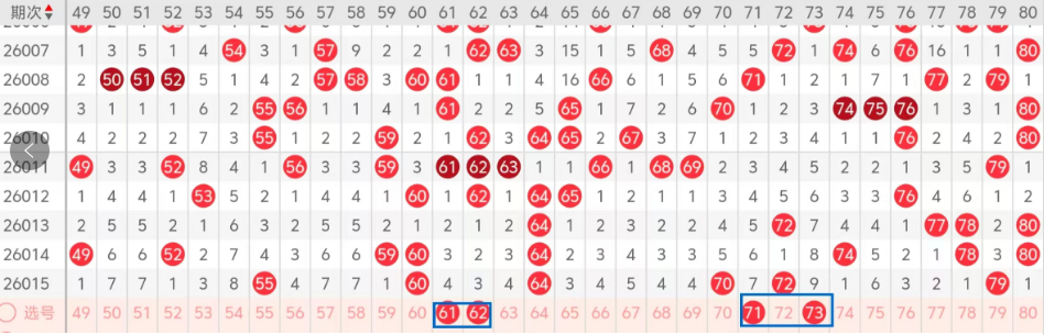 第四区间的走势分析:第四区间上期开出了四个号码球,主要的落号点位在四区间的后半区,走出了一奇三偶的形态走势,上期四区间的前半区落下了一个号码球,后半区落下了三个号码球,整个四区间处于走冷的趋势,根据四区间的走势规律,今天的四区间我们主看前半区热码61 62的回补,至少有一码落下,再看后半区72的分边码71 73,这两个号码球的落位,落下一码的机会很大,这四个号球建议大家打个四码复三,或者打个四码复二比较稳妥,参考为主!
