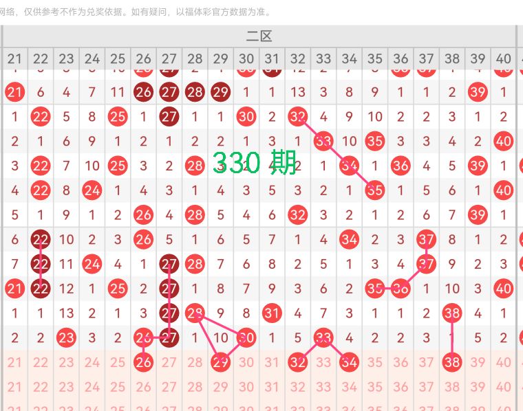 21-40区间,上期开出5个号码(23 26 27 30 33),重点号码为26、34、38,26近30期有10次出现,是区间内的核心热号,且多次与27形成连号,与上期开出的26、27形成延续性关联,走势强劲;34近30期出号间隔均匀,无长时间断档,且处于21-40区间的出号密集段,与33、30等已开号码形成呼应;38近30期有4次出现,曾多次在区间出号量平稳时作为补充号码,连号潜力与补位价值兼具。备用号码选取29和32,29近30期出号频率逐步提升,走势稳健向上;32则覆盖31-40子区间的空缺,与33形成邻号组合,能有效降低选号风险。因此综合推荐该区间号码【26 29 32 34 38】