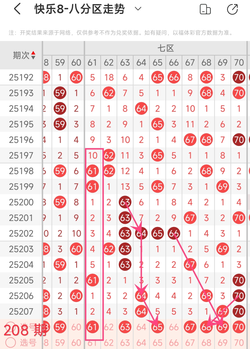 上期七区开出64 69 70这3个号码,本期考虑出2个左右。