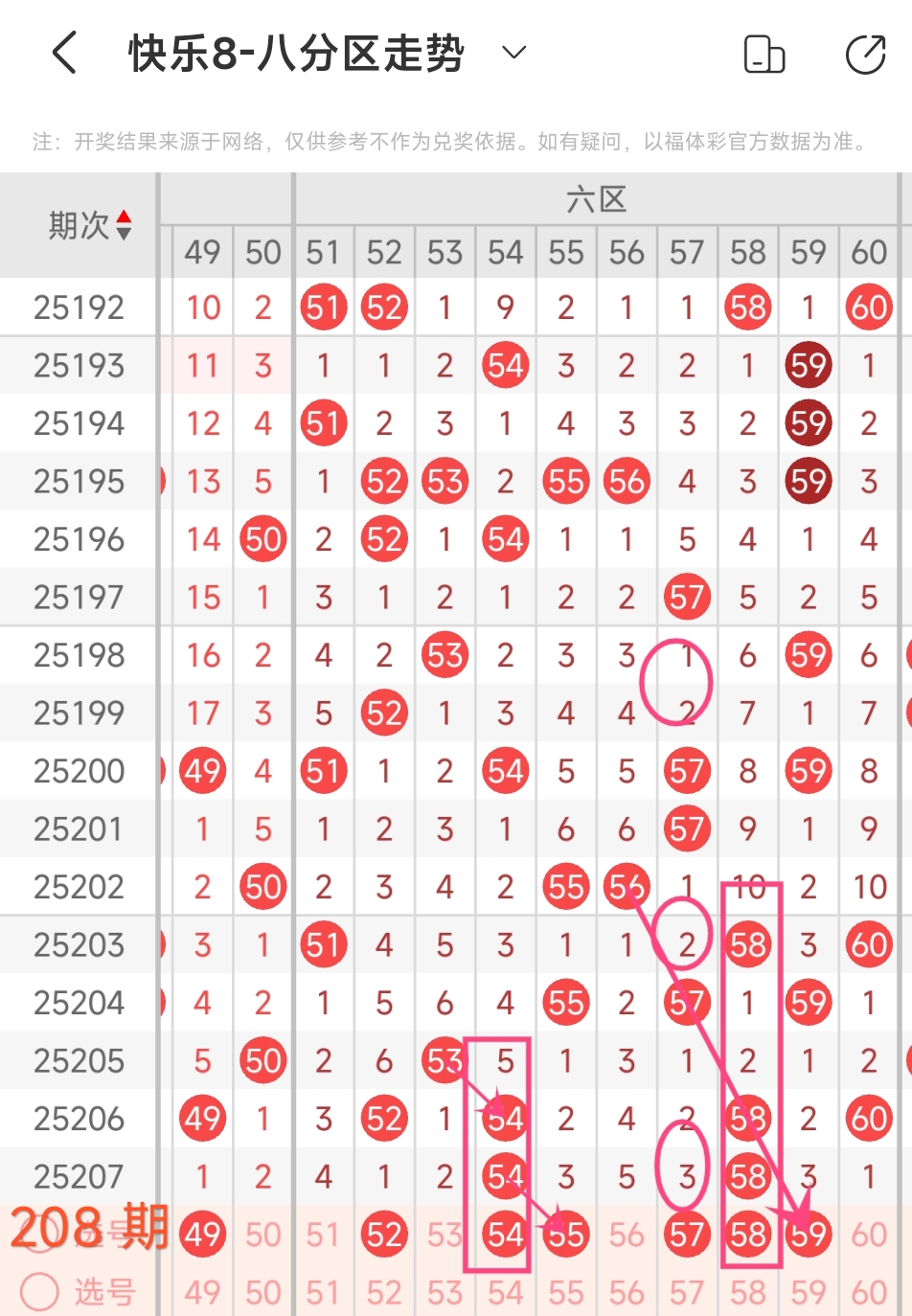 上期六区开出54 58这2个号码,本期应该出3个。