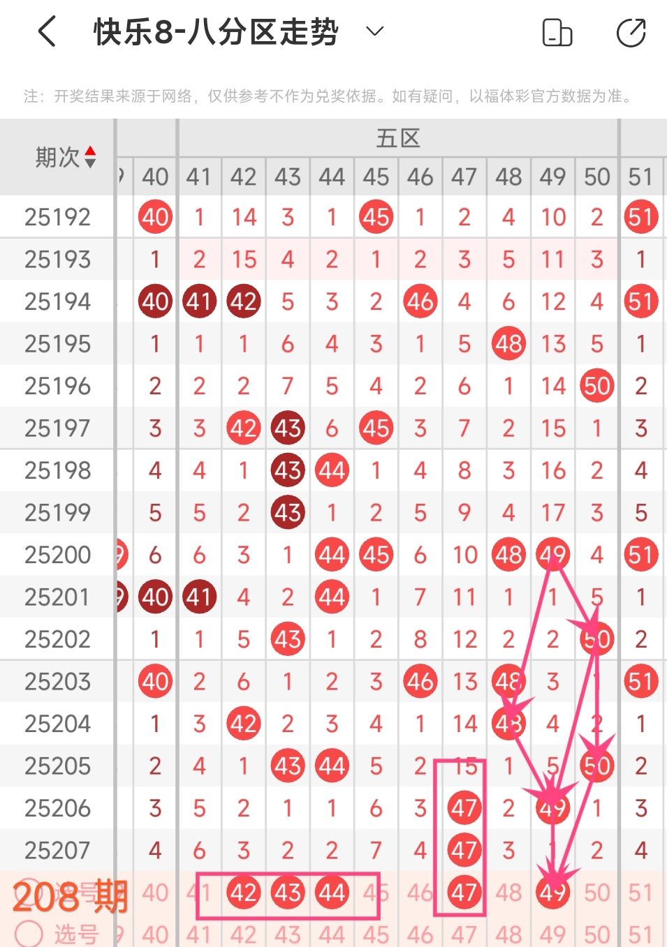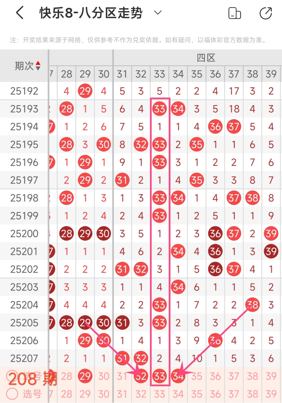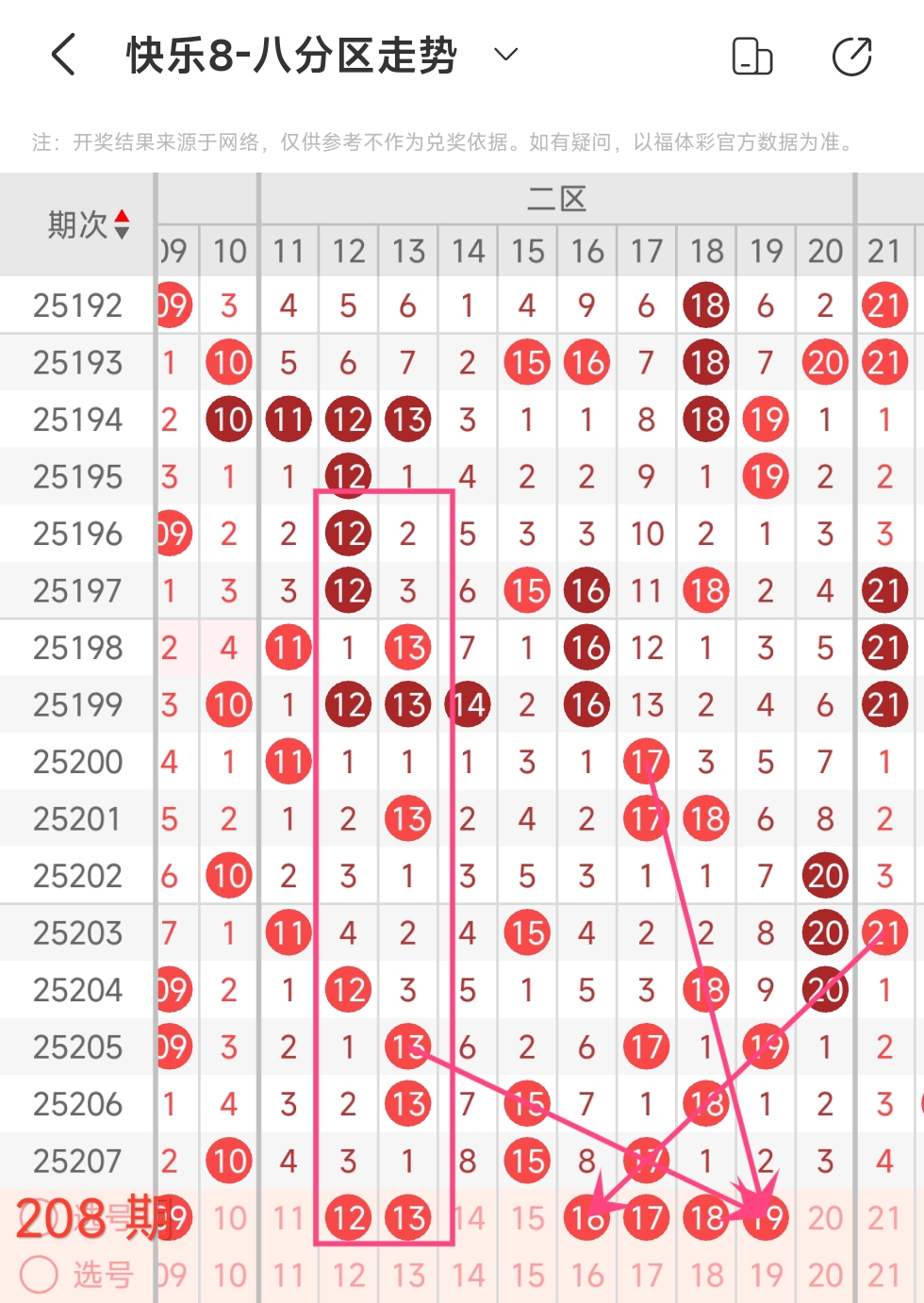 在快乐8的探索之旅中,通过对开奖走势图细致入微的观察,我们总结出一些具有参考价值的规律。几乎每一期开奖号码都呈现出以下显著特征:其一,大概率出现连号;其二,常常伴有边码;其三,遗漏值为1 2 3的号码频繁现身;其四,重号现象也较为常见。掌握这些要点,能为我们的投注提供方向指引。我们约定采用八分区走势图来展开分析。