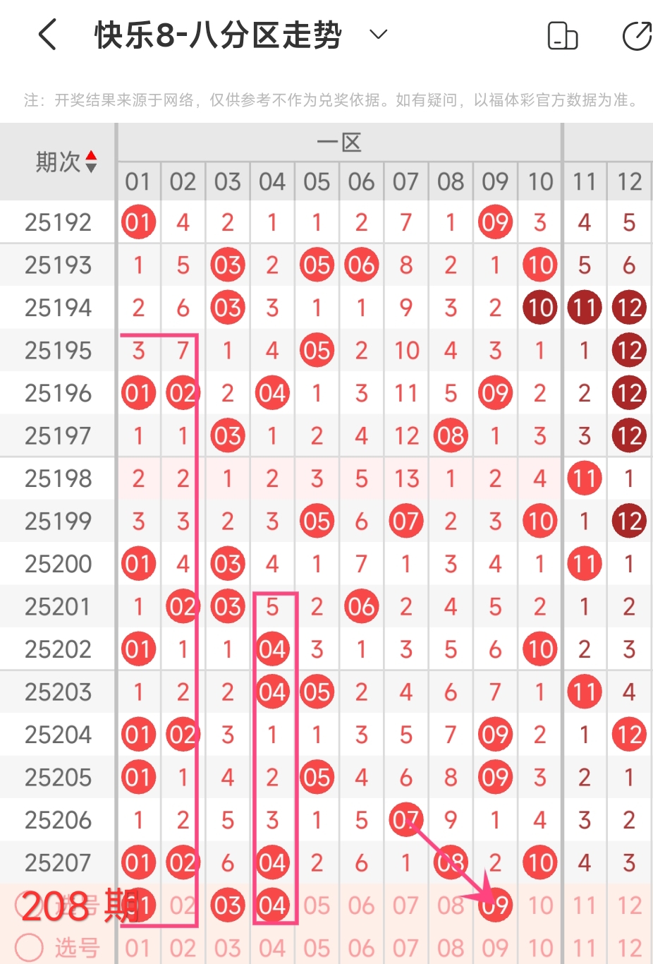 上期一区开出01 02 04 08 10这5个号 码,本期应该出3个左右。