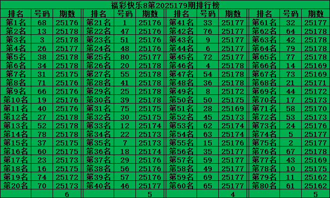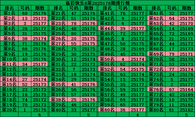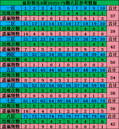 最后再把号码分为五区:一区01-16号、二区17-32号、三区33-48号、四区49-64号、五区65-80号,理论上每个区每期应该开出4个号码,2025178期五区比例:3:3:6:4:4