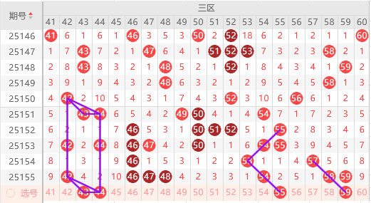 上一期第三区间开出了42-46-47-48-54-58-59七个号码,三区上一期成为热区,而且带出了三连码的走势,这个近期刚刚出现过的形态再一次出现,预示了三区有可能出现抄作业的走势。上一期三区前后开号相对比较均匀,本期点位居多的走势下,选择更是难上加难。尤其是三区目前的明码机会更多,势必会影响我们的思路跟进,这一点一定要注意。
