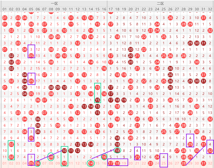 边号1 3 7 9 15出一码,重号防2,形态上6 14是斜连号,上图已勾画,其次隔9期号很喜欢漏1回补,本期10可以关注,同期遗漏值10 11 12三出一,关注五码2 3 5 10 14