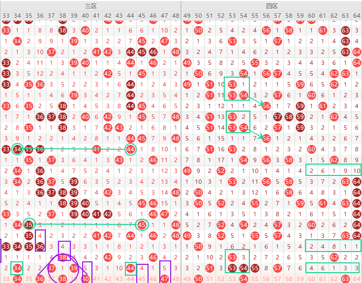 三区应该是走热趋势,边号33 35 36 38 40 43 45出1-2码,重号防37 34 39 44出一,形态上38是梅花,上期出同尾号34 44,参考上面勾画当期出同尾号,下期出一码重号,本期34 44有机会出一码,其次就是39,遗漏值隔5期号40 47二出一,关注五码34 36 39 40 47