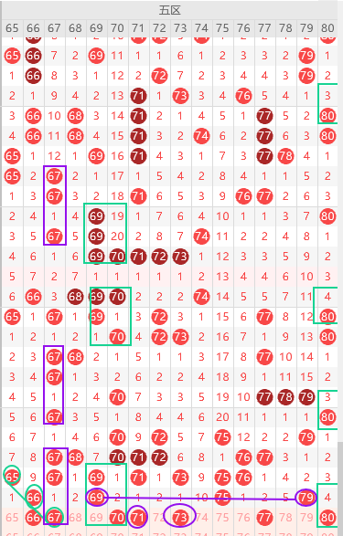 边号65 67 68 70 74 76 78 80出1-2码,重号防66 69 79出1,形态上67 70跟上面勾画一样,复制形态,本期看好0尾回补70 80出一,80跟上面一样走势隔3期 4期遗漏,同期遗漏值67 65 73三出一,同尾号一直在出重号,上期69 79同尾号,本期五区应该走冷,趋势有可能断,看上69 79可以拿一码,冷号出多期,本期只有74,防守74,关注五码66 67 70 73 80防74