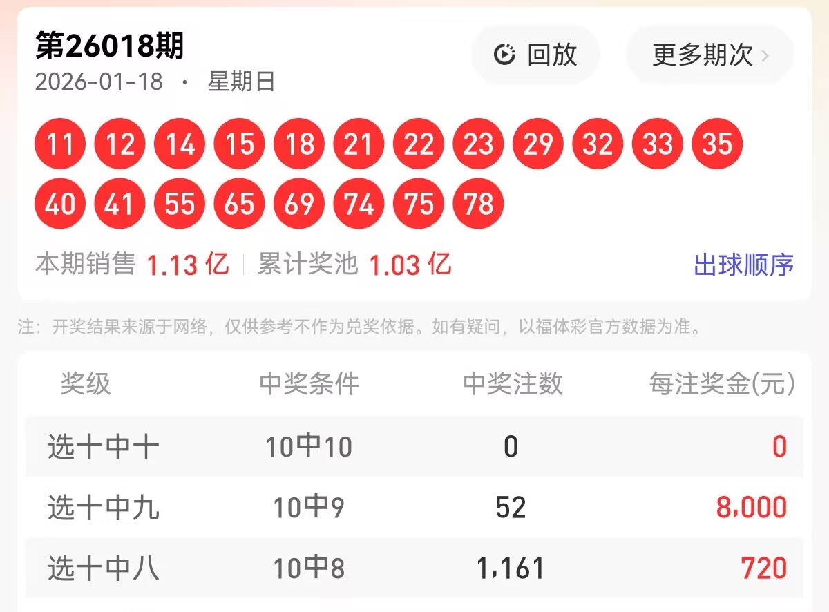上期福彩快乐8第 2026018期开奖号码为【11 12 14 15 18 21 22 23 29 32 33 35 40 41 55 65 69 74 75 78】,其中大小比7:13,奇偶比为12:8,和值为762,跨度67,四区间比为5:8:2:5。下面是对本期对于每个号码的详细分析。