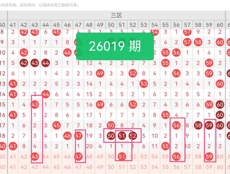 上期第三区间开奖2个号码,本期可能会稳定开出。43紧邻上期开出的41,属于邻号回补,且是中后区的高频温号,出号稳定性强;47和51分布在45-55中段,该区间上期完全空缺,补位概率高,且两者一奇一偶(47奇、51奇),保持奇数号码的连贯性;56和59属于56-60段,上期仅55开出,该段需补充号码完善区间分布,56为偶数,59为奇数,符合中后区出号的奇偶均衡特征,能有效填补上期的区间空白。
