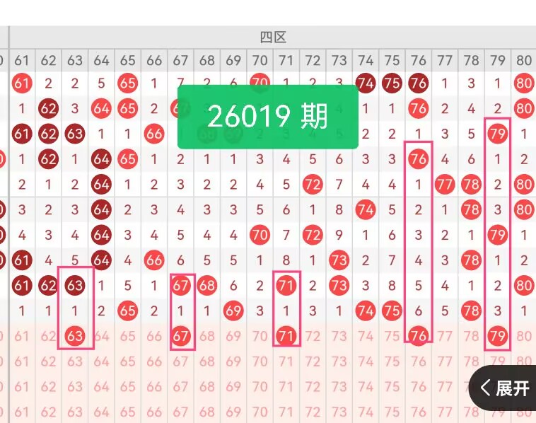 上期第四区间开奖5个号码,本期有望减少开出。63属于61-64段,上期该段空缺,补位需求强烈,且是后区的温号,出号节奏适中;67紧邻上期热门的65、69,属于中间补位号码,避免过度集中在热门段;71属于70-73段,上期该段空缺,需补充号码平衡区间;76和79分别覆盖76-80段的中间和末端,上期74、75、78开出,76作为中间补号,79作为末端空缺补号,完善区间分布。