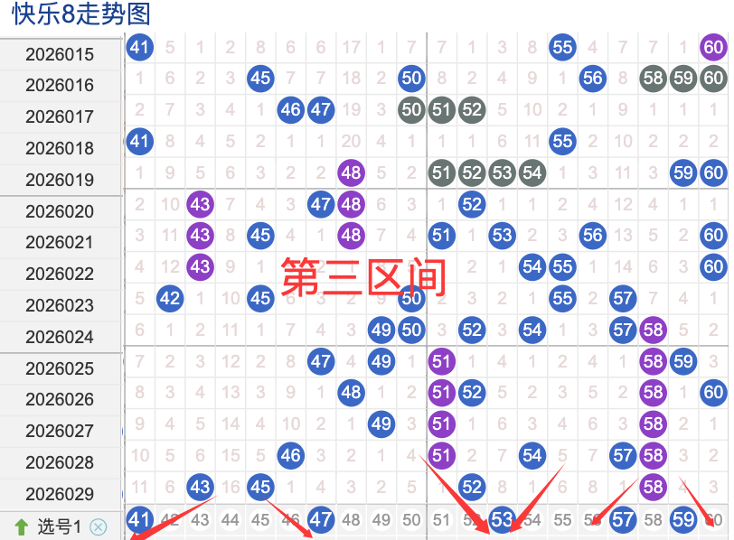 三区间开出了4个奖号(443.45.52.58)上期回顾三区开出4个奖号上期的三区间的奖号数量呈现一个递减的形态,4头回补2号码,本期先来看号码41近期出现频率相对来说是很稳定。偶尔有时间隔期数也是很长,说明其在近期的开奖中较温冷的,号码47在近 30 期内出现次数相对较不是稳定的号码,近期的活跃度也是较温热。号码53有一定的间歇性,通常间隔5-3期会出现一次,没有明显的连续出现态势,走势相对不是很稳定,在整个第三区间的表现本期还是可以防守的。号码59走势相对近期较,近期有连续间隔落号的情况,活跃度近期处于较状态注意防守。