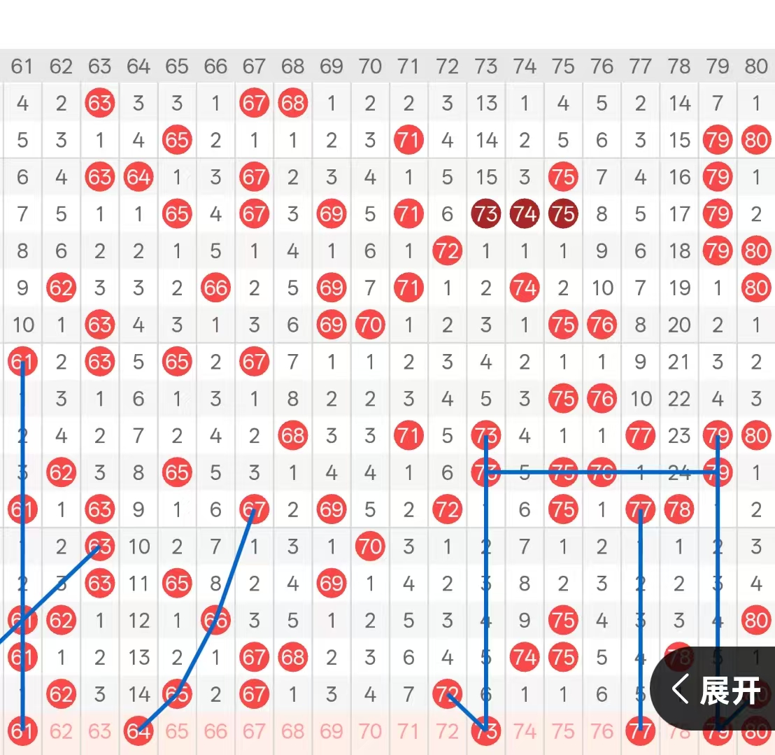 四区:四区间上期开出了5码,六字头头部位置倒三角空1下落的62,中部位置空2等距下落的65,以孤码形态开出,尾部位置开出了六十七六十八对子座重的六十七。七字头开出头部位置4期遗漏下落的72,尾部位置空1回补的80,两码均以孤码形态开出,中部位置处于放空状态。本期六字头头部位置可优先关注65孤码的分边号码,大遗漏下落的64在本期为14期遗漏,可作为重点防守,其次6163两码二选1即可。尾部位置67的双重分边,防守68的倒三角开出。七字头头部位置本期可关注七十三、七十六、七十九三码6期遗漏可考虑一码开出,优先考虑7376两码形态号码的开出,尾部位置考虑80的孤码座重,中部位置防守77的五期遗漏下落即可。