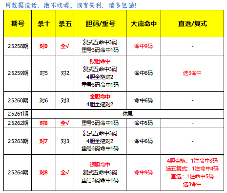 上期杀10码对9,免费文章杀5码对4,复式五命中3码,大底推荐命中7码,本期再接再厉。