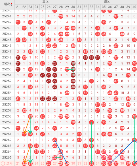 四区开出:35,36,38 奇偶比: 1:2 和值:109 跨度:3,上期开出3个号码,偶数号码占优势。本期三斜连走势:35 36 37 39,隔码斜连走势:37 40,近10期平均出号2.6枚。本期推荐关注号码:33、36、39、40。