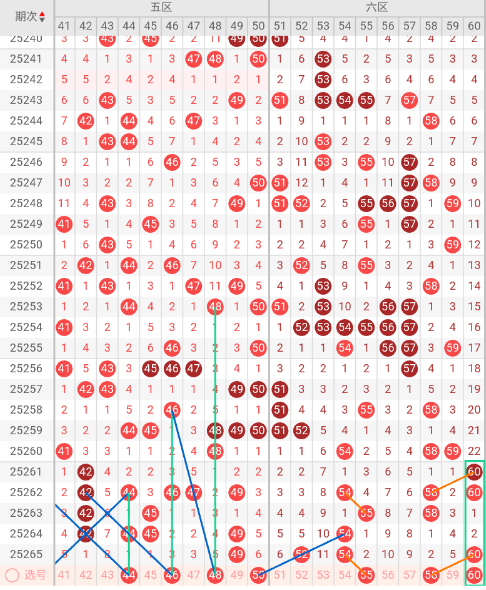 六区开出:52,54,60 奇偶比: 0:3 和值:166 跨度:8,上期开出3个号码,偶数号码占优势。本期无三斜连走势,无隔码斜连走势。近10期平均出号2枚,本期推荐关注号码:55、58、60。