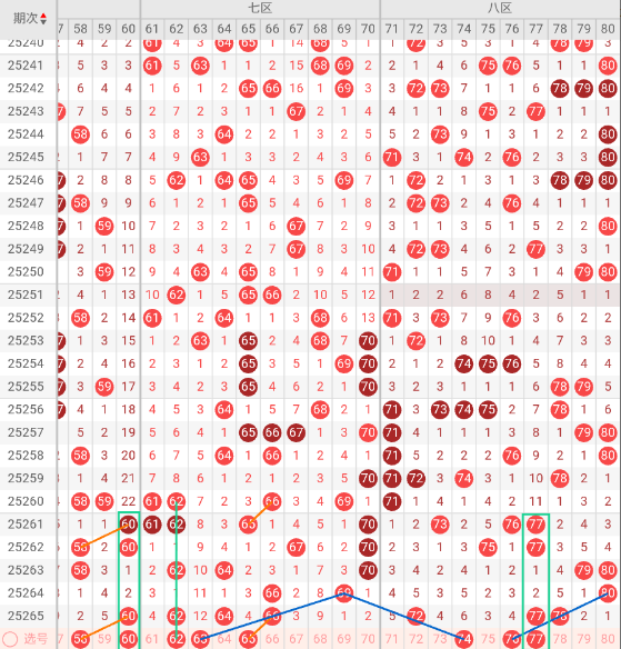 七区开出:62,64,66 奇偶比: 0:3 和值:192 跨度:4,上期开出3个号码,偶数号码占优势。本期无三斜连走势,隔码斜连走势:63。近10期平均出号2.7枚,本期推荐关注号码:62、63、65。
