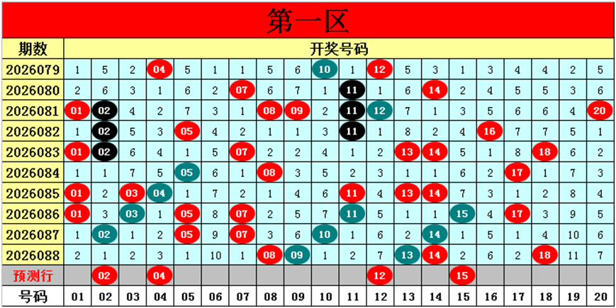 目前第一区包含14个热码:重码5个08、09、13、14、18,邻码4个07、10、15、17,孤码5个01、02、03、05、11;包含2个温码:邻码0个,孤码2个04、16;包含4个冷码:邻码2个12、19,孤码2个06、20;号码冷温热个数比为4:2:14,重号、邻码、孤码个数比为5:6:9。