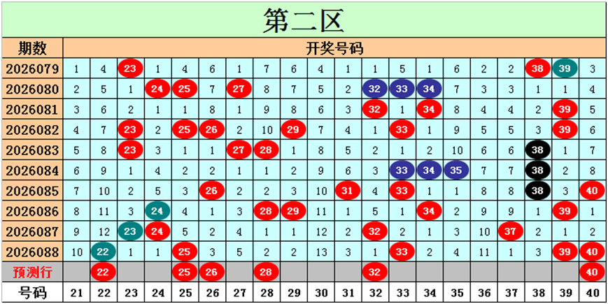 目前第二区包含12个热码:重码5个22、25、33、39、40,邻码4个23、24、32、34,孤码3个28、29、37;包含5个温码:邻码2个26、38,孤码3个27、31、35;包含3个冷码:邻码1个21,孤码2个30、36;号码冷温热个数比为3:5:12,重号、邻码、孤码个数比为5:7:8。
