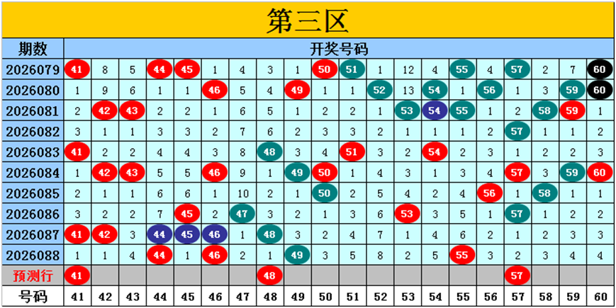 目前第三区包含11个热码:重码4个44、46、49、55,邻码4个41、45、47、48,孤码3个42、53、57;包含8个温码:邻码4个43、50、54、56,孤码4个51、58、59、60;包含1个冷码:邻码0个,孤码1个52;号码冷温热个数比为1:8:11,重号、邻码、孤码个数比为4:8:8。