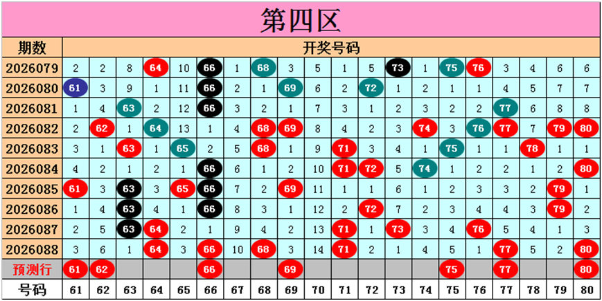 目前第四区包含11个热码:重码6个64、66、68、71、77、80,邻码4个63、72、76、79,孤码1个73;包含7个温码:邻码3个65、69、78,孤码4个61、62、74、75;包含2个冷码:邻码2个67、70,孤码0个;号码冷温热个数比为2:7:11,重号、邻码、孤码个数比为6:9:5。
