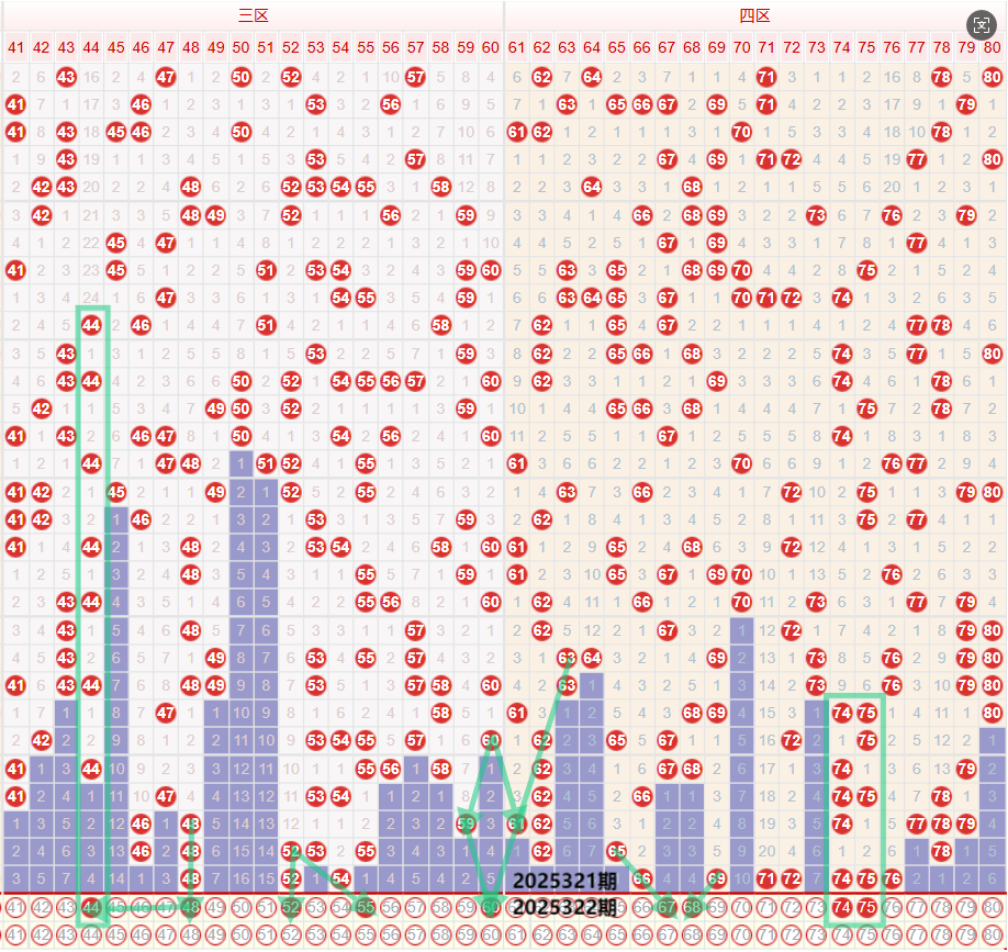 如图所示:在本期大数区的选号中注意在上期的走势中三区间开出了3枚中奖号码,落位在区间最低位的同步走势,同时开出了48 52的两枚重号走势,此形态在上期的四区间刚刚开出,因此本期的三区间是有着较高概率出现单区间高位的走势,四区间开出了三枚中奖号码,保持着两枚重号走势,在下期的走势中落号数量上升至7枚,与本期的三区间落号形态基本保持一致,因此本期要注意三区间的整体走势,单从号码的走势来看,本期还是要注意上期开出的48 52继续考虑重号走势,目前的44出现热回补走势之后,目前仅遗漏4期,还是需要继续关注的,在上期的开奖结果中55还依旧还是带出了66号,保持着较强的联动关系,因此本期要注意55的遗漏一期走势,或者是66号的重号走势,四区间在上期开出了7枚中奖号码,落号数量在区间同步的最高位走势,结合上方对数值的参考分析,本期注意四区间的落号数量出现幅度较大的下降走势,重点关注在上期开出74 75 76的三连走势下方考虑一组二连重号走势,在上期开出66 69的位置下方重点考虑夹二连的67 68