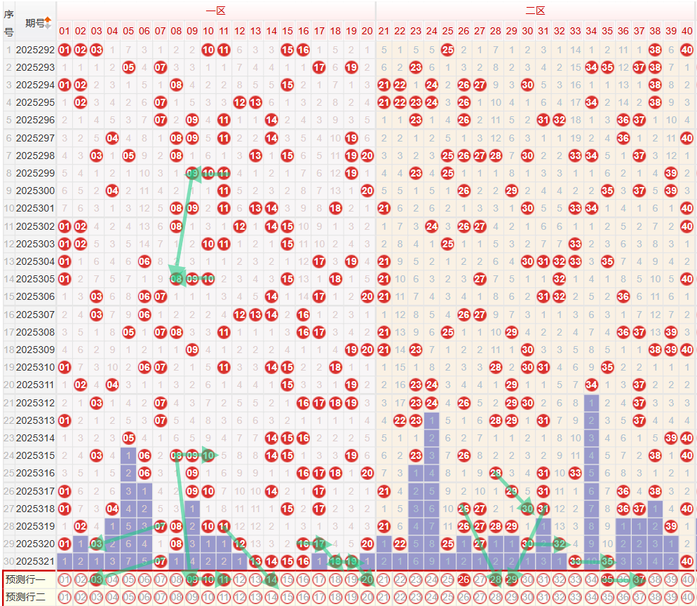 如图所示:在本期小数区的选号中,注意在上期的走势中一区间开出了7枚中奖号码,继续保持在均值以上的水平,继续保持在区间的同步最高位走势,结合上方对本期数值的分析参考本期要注意13 14 15 16的位置考虑重号走势,从面的落号热度来看,本期要注意14 16的偶数重号,尾部位置注意20 22的遗漏一期走势,可考虑二选一走势,也可以考虑再次同步开出,这一要注意一在上期的开奖结果中单码下方分双边的号码均为出现重号走势,因此本期注意单点位的双码遗漏一期走势,前段位置注意03 07的交替走势,重点关注03或者是考虑07的重号走势,目前的一区间连号开出频率非常高,此连续性不错,在上期开出13 14 15 16的位置注意向前继续考虑09 10 11的三连号走势,二区间上期的开奖结果中是出现了断2号头的走势,本期注意头部位置22的遗漏一期回补走势,中段位置注意28 29遗漏二期走势,在近期的走势中二区间的同期遗漏二期落号形态较热,在近期的走势中开出了28 31同步遗漏二期,连续开出了三期走势,本期注意26 29的同步遗漏二期走势,3字头的号码上期开出了33 35的奇数二连走势,以及凤尾的40号,本期注意35 40的重号考虑,以及在上期开出33 35的奇数二连走势之后,本期注意继续向后顺延35 37的奇数二连走势。