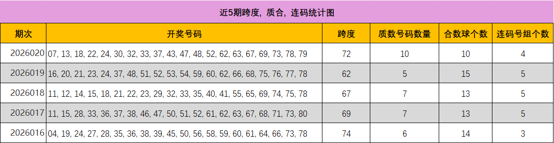 上期质数强势回补至10个,完美验证了上期“强烈看涨”的判断,质合比达到完美平衡。近五期合数仍略占优。预计本期质数个数可能从高点小幅回落,维持在7-9个的均衡偏高水平。关注质数:07, 13, 17, 19, 23, 29, 31, 37, 41, 43, 47, 53, 59, 61, 67, 71, 73, 79。关注合数:18, 22, 24, 30, 32, 33, 48, 52, 62, 63, 69, 78, 80。