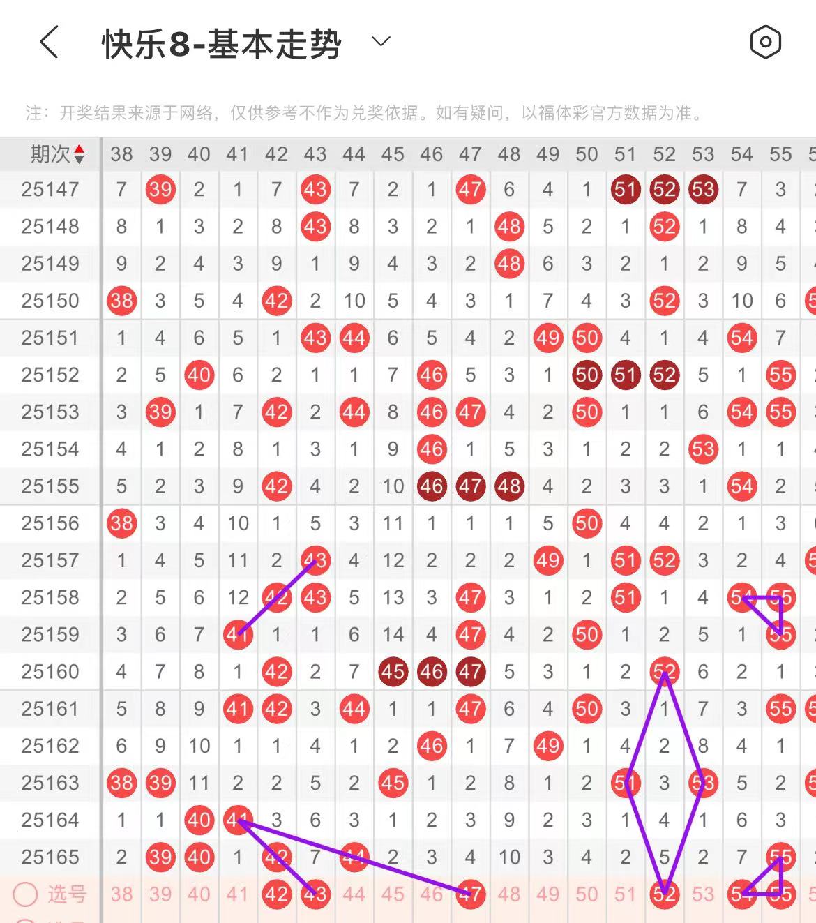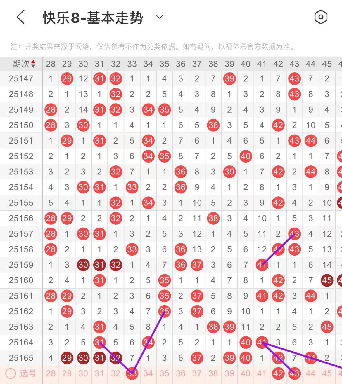 31-40区:本区间上期开出了五个号码,从号码走势图上看,上期出号个数突增,本期注意出号个数减少的可能,在选号上建议以防为主。本期有出号走势的号码有33号,双线斜连出号走势。