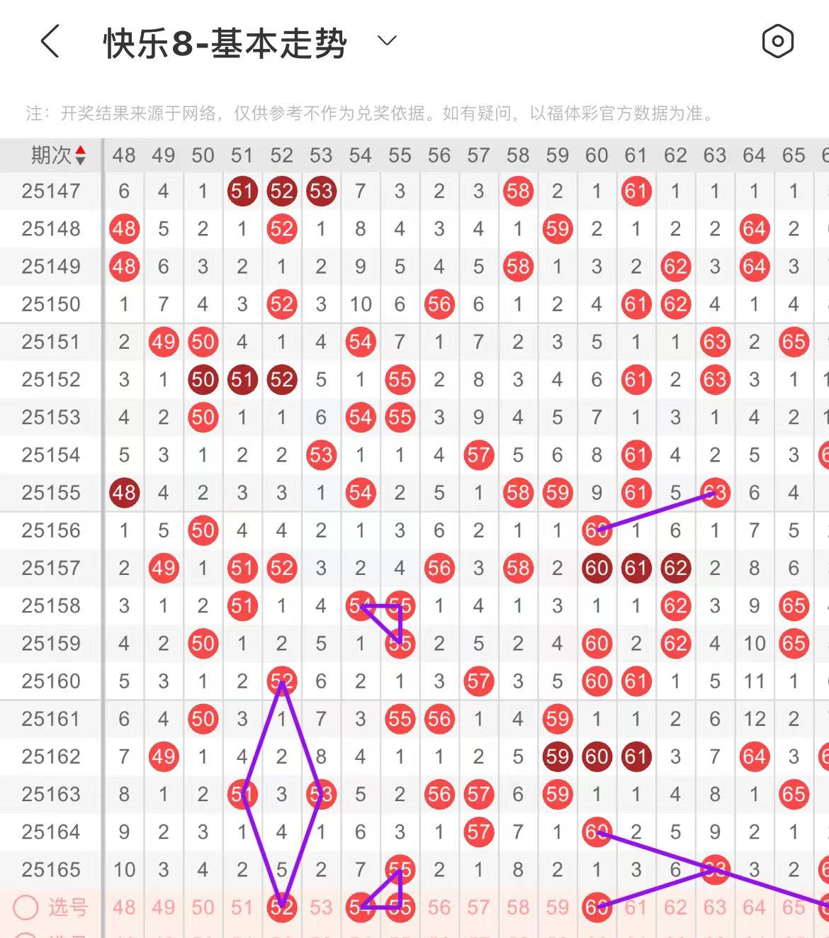 51-60区:本区间上期开出了一个号码,从号码走势图上看,该区现属于温号区,上期只出一个号码,本期出号个数有可能增加至三个号码左右,在选号可考虑多做选择。本期有出号走势的号码有52号,菱形走势形态,54.55号,形成一个小三角走势形态,60号,63对应60出号走势。