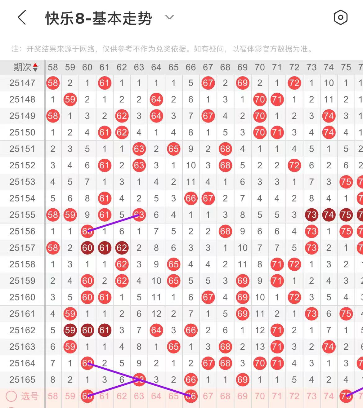 61-70区:本区间上期开出了三个号码,从号码走势图上看,本期可参考的号码走势甚少,注意出号个数突减少的可能,在选号上需谨慎。本期有出号走势的号码有66号,斜连出号走势。